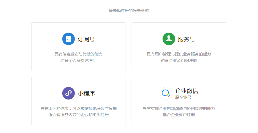 微信公众账号分为:服务号、订阅号以及企业号,截止目前轻松盈科技只针对服务号、订阅号以及小程序操作(如下图);